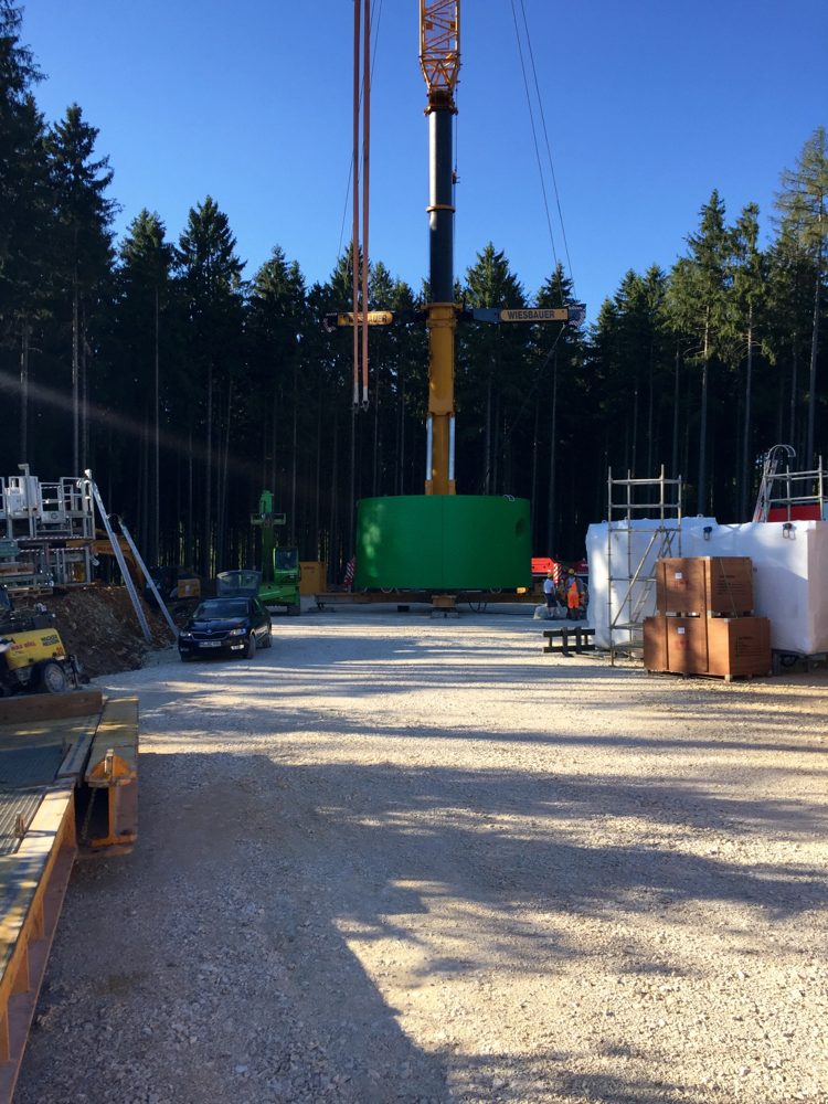 Für den Turmbau des ersten Windrads wurde gestern und heute der "kleine" Großkran aufgestellt. Mit diesem werden die Betonturmteile auf das Fundament gehoben.