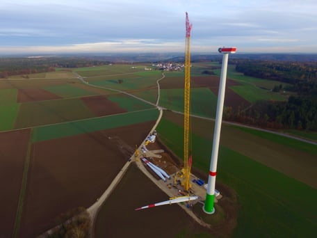 Nach Fertigstellung des ersten Windrads wird der Großkran auf die zweite Kranstellfläche umgesetzt. Ab heute Nacht bis Anfang nächster Woche werden die Stahlrohrtürme, das Maschinenhaus und die Rotorblätter der zweiten Anlage angeliefert