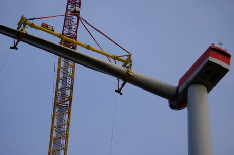 Am Samstag wurde das Maschinenhaus montiert. Heute wurde die Nabe und das erste Rotorblatt montiert. Voraussichtlich morgen werden die anderen beiden Rotorblätter montiert. Unabhängig von Wind und Wetter findet die Montage des Aufzugs und der Anschluss der elektrischen Komponenten statt.