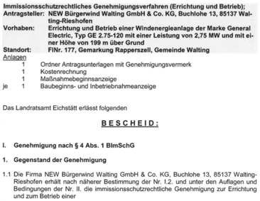 Das Landratsamt Eichstätt hat Ende September die Genehmigung für die Errichtung und den Betrieb des neuen Bürgerwindrads Walting Nord erteilt.