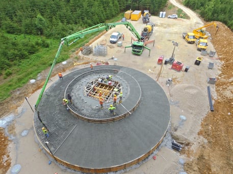 Gestern wurde das Fundament mit 880 qm betoniert. Das Fundament liegt nur ca. 70 cm unter der natürlichen Geländeoberkante und hat einen Durchmesser von 25 m und eine Höhe von 2,9 m.